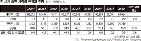 주목할 부분은 종이책과 전자책을 포함한 출판시장 전체 성장률이다. 종이책 시장 성장률의 둔화 속도에 비해 전자책 시장 성장률이 매우 가파르다. WGA는 2012년 이후 4년간 출판시장 전체 성장률을 0.6%로 내다봤다. 전자책이 독서 시장을 위축시킬 것이라는 우려와는 달리 새로운 독서 시장을 창출할 것이라는 얘기다.